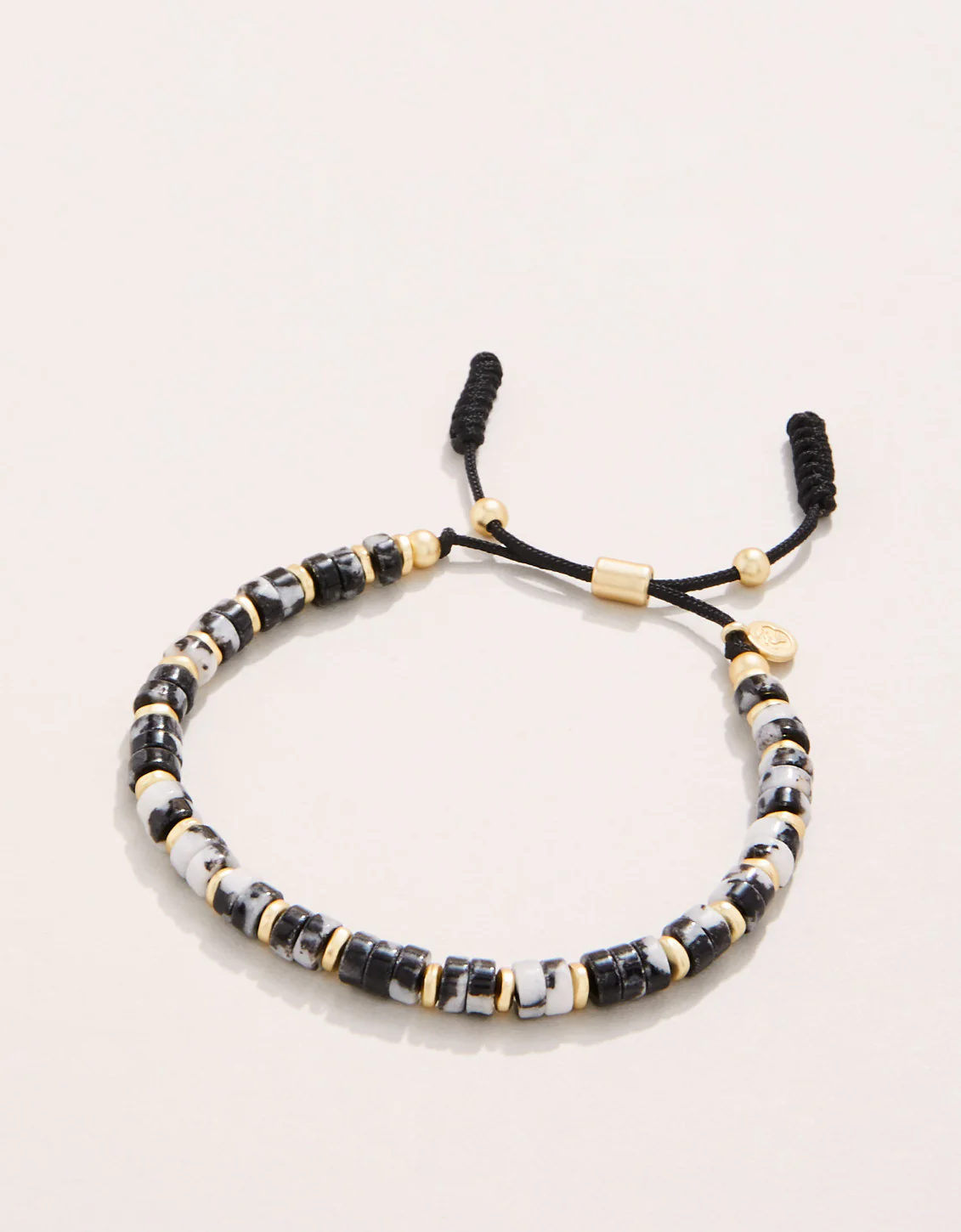 De estilo clásico con un toque diferente, nuestra pulsera deslizante de piedra deslumbra con su baño de oro mate de 18 kt, jade natural blanco y negro, cuerda de nailon y cuentas de metal. El cierre deslizante proporciona un ajuste perfecto.